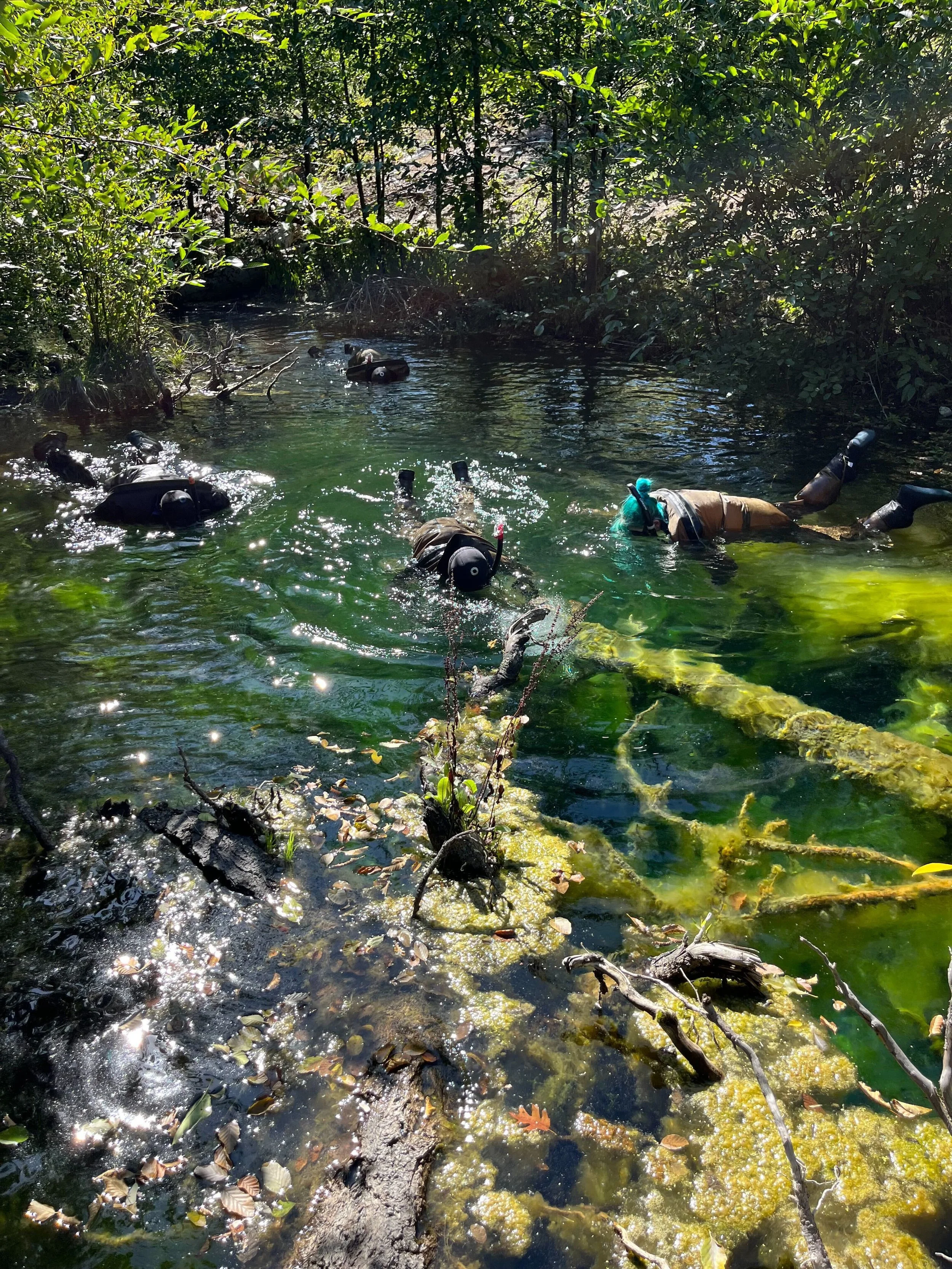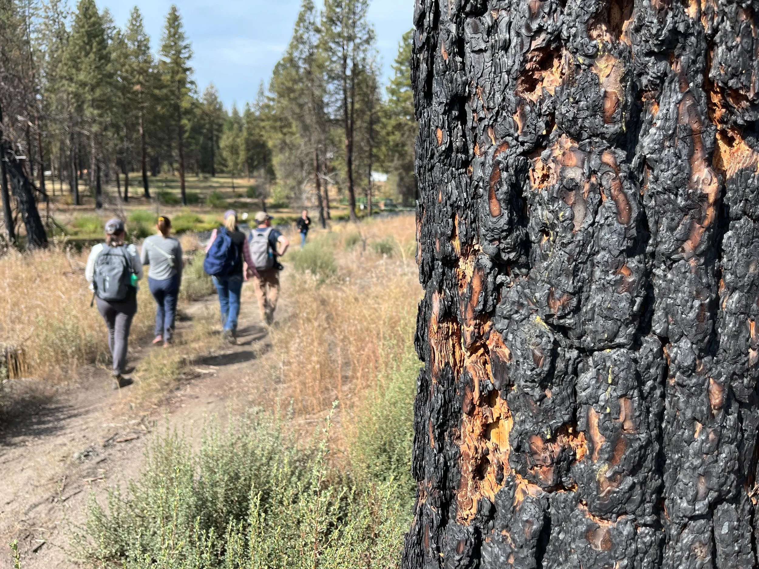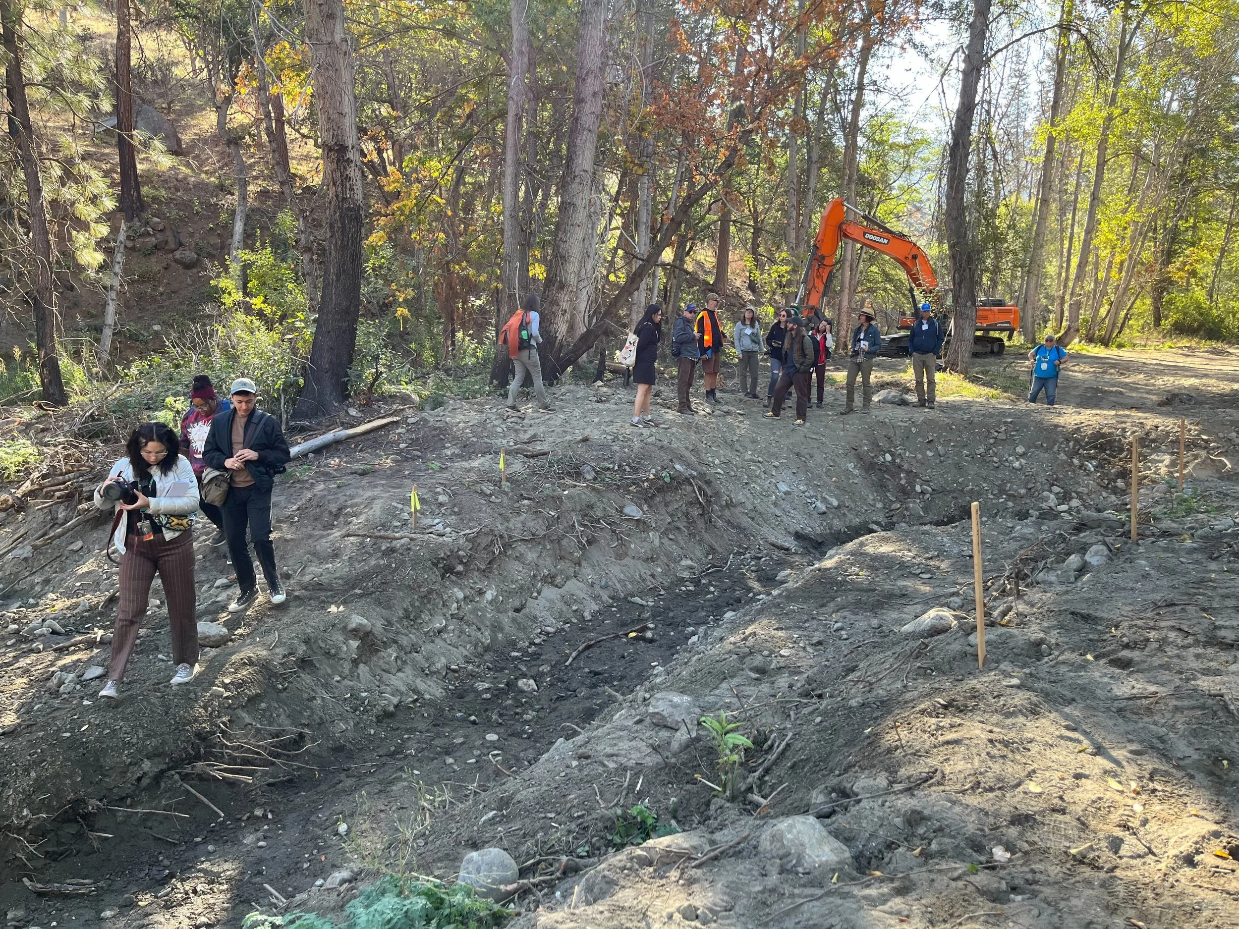 On Wednesday the group spent the morning with folks from the Mid Klamath Watershed Council who are working on a project led by the Karuk Tribe to create off-channel ponds on Klamath tributaries for juvenile coho salmon to use to overwinter (an important part of their early life cycle). The journalists saw one pond in the process of being built, and Fellows suited up in dry suits to see the results of a finished one - and even saw some young coho salmon using it as intended! Then we met with Bill Tripp, director of Natural resources and environmental policy for the Karuk Tribe and some members of local fire crews to talk about restoring intentional and cultural fire to the landscape as plumes from current fires drifted overhead.